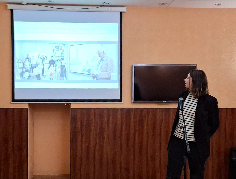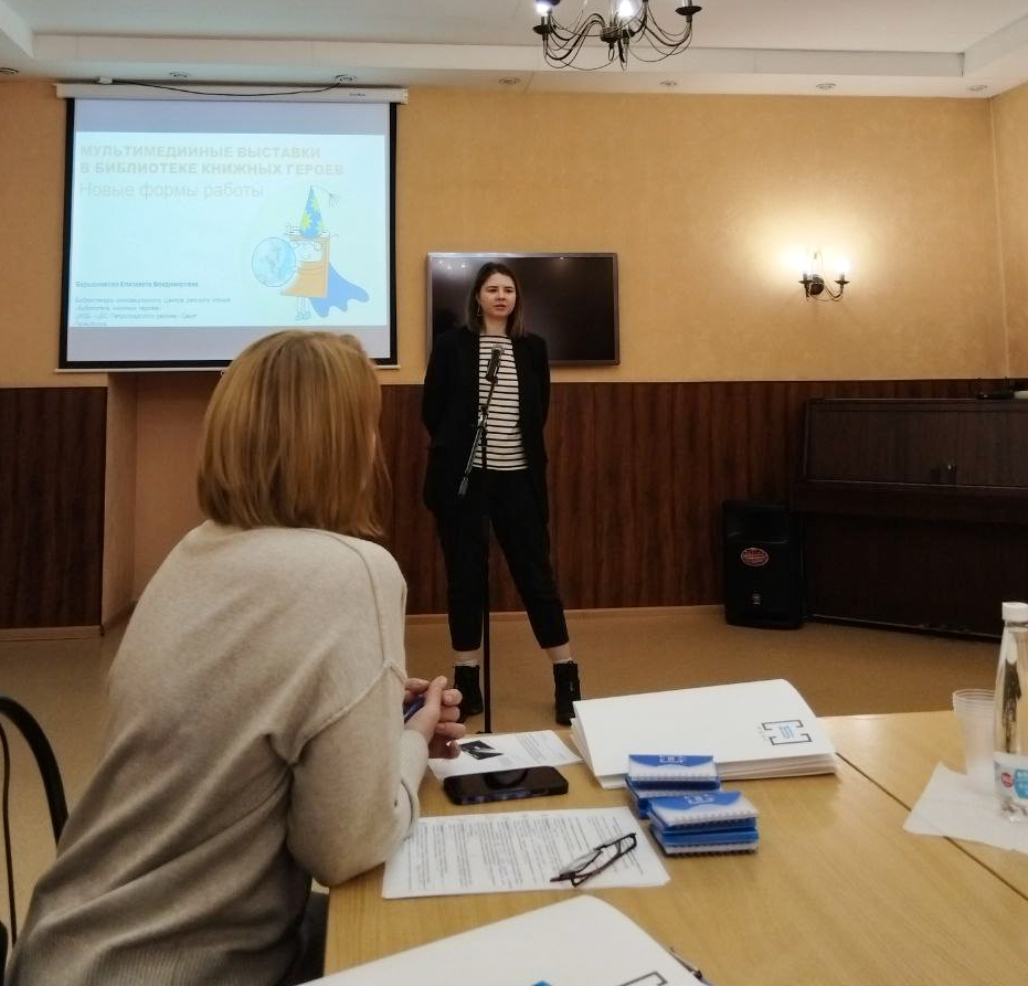 Елизавета Владимировна Барышникова, библиотекарь I категории инновационного Центра детского чтения «Библиотека книжных героев» представила доклад «Мультимедийные выставки в Библиотеке книжных героев. Новые формы работы».