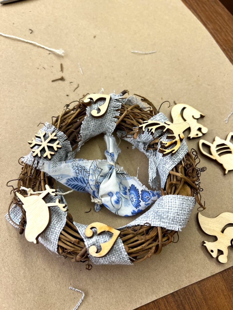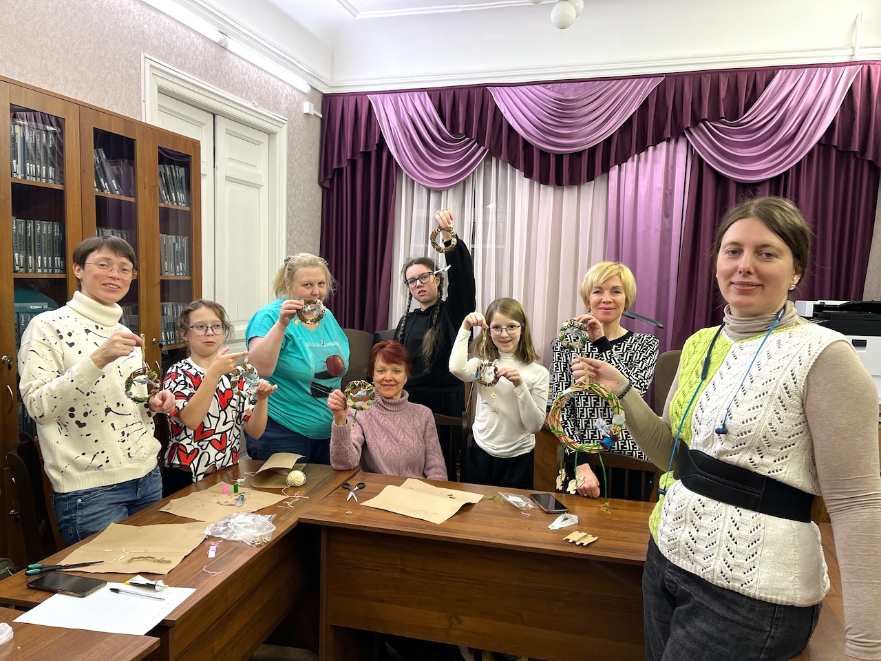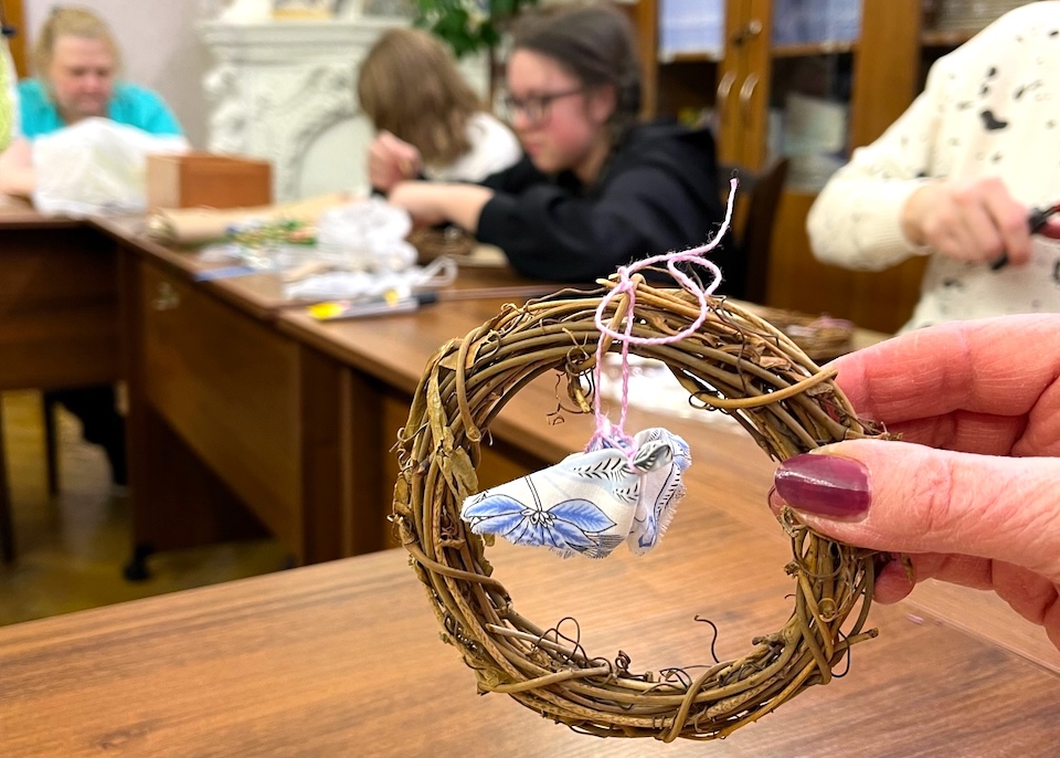 Венок, который предложила изготовить из веточек, ткани и деревянных элементов декора библиотекарь Виолетта Ивонина, предназначен для украшения и охраны дома. Его можно вешать либо при входе, либо прямо на входную дверь. У всех участников венки получились разные, не похожие друг на друга.