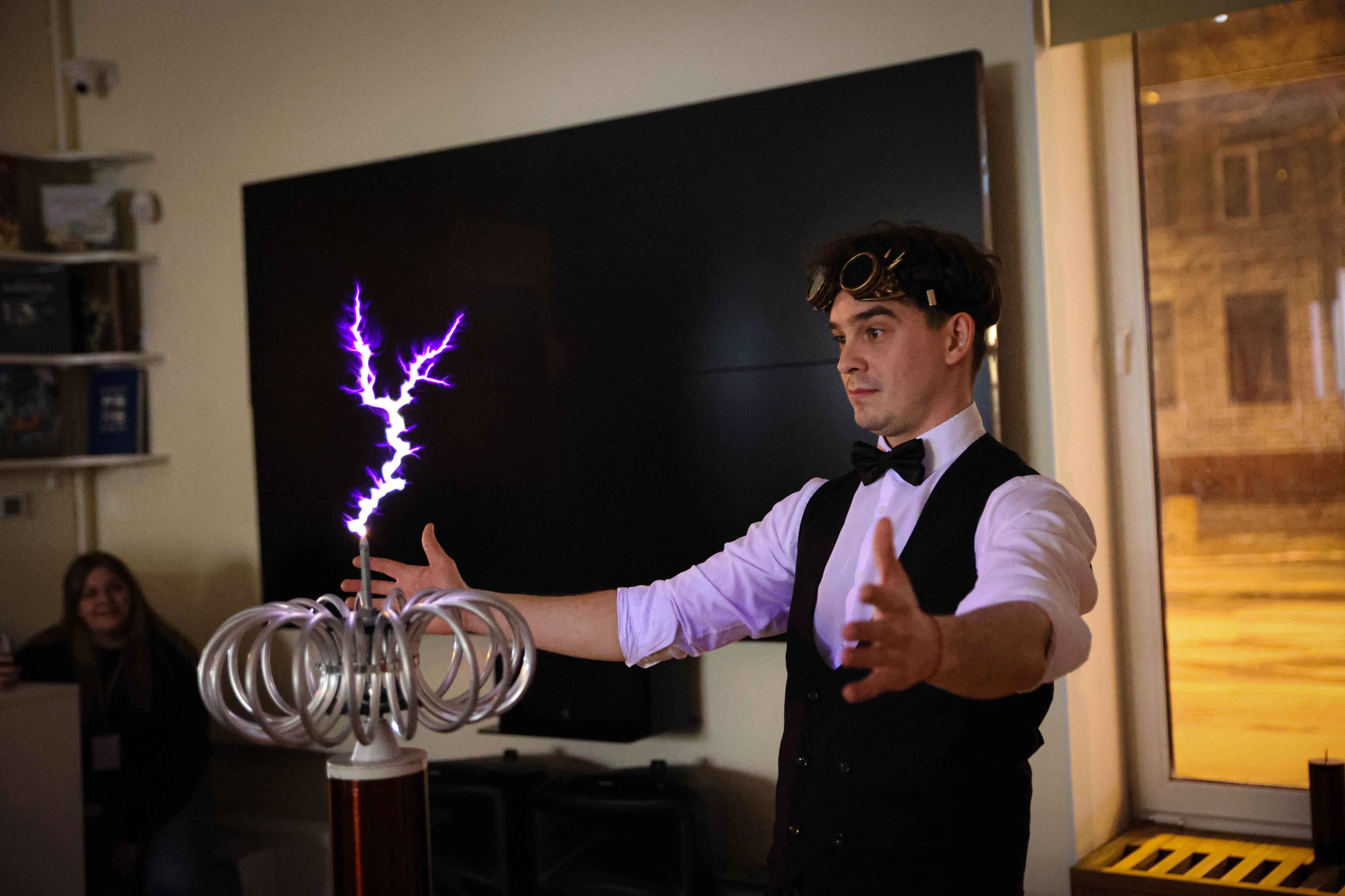 На ярком познавательном занятии «Тесла-шоу», в котором использовалась безопасная катушка Тесла, генерирующая настоящие электрические разряды, каждый желающий смог не только принять участие в экспериментах с плазмой, электрическим полем, включением электрических приборов на расстоянии без проводов и электричества, но и испытать на себе, как абсолютно безопасно прикоснуться к молнии.