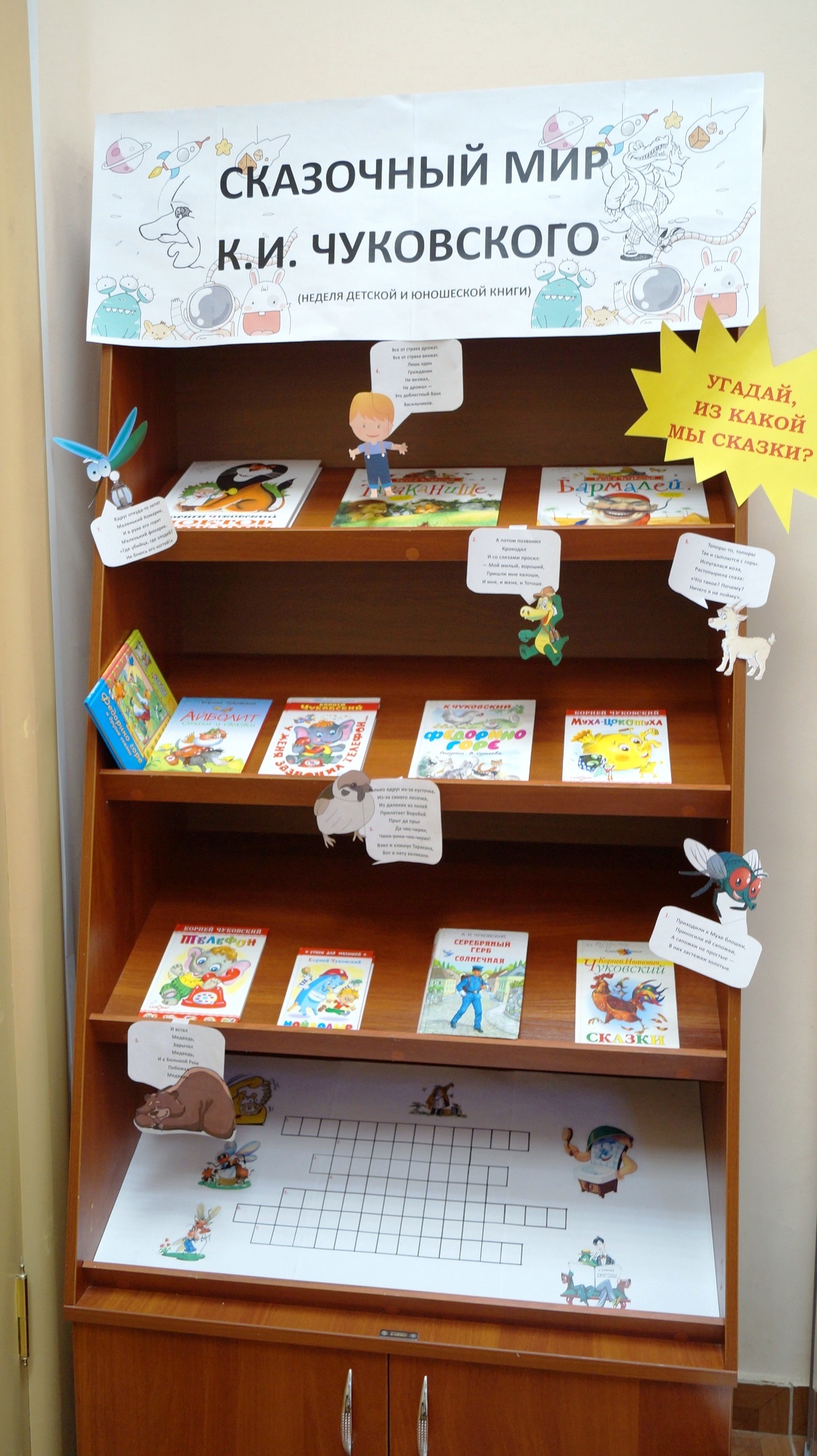 Уже 23 марта в библиотеке появилась книжно-иллюстративная выставка «Сказочный мир К.И.Чуковского», где можно было не только взять книжки, но и разгадать кроссворд, угадывая персонажей. Совместно с 56 гимназией мы поиграли в игру «В поисках волшебного театра». Ребята вместе с Буратино побывали в самых разных переделках, но с их помощью деревянный мальчик смог выбраться из сложных ситуаций, обрёл Золотой ключик, которым открыл театр и стал прилежным мальчиком.