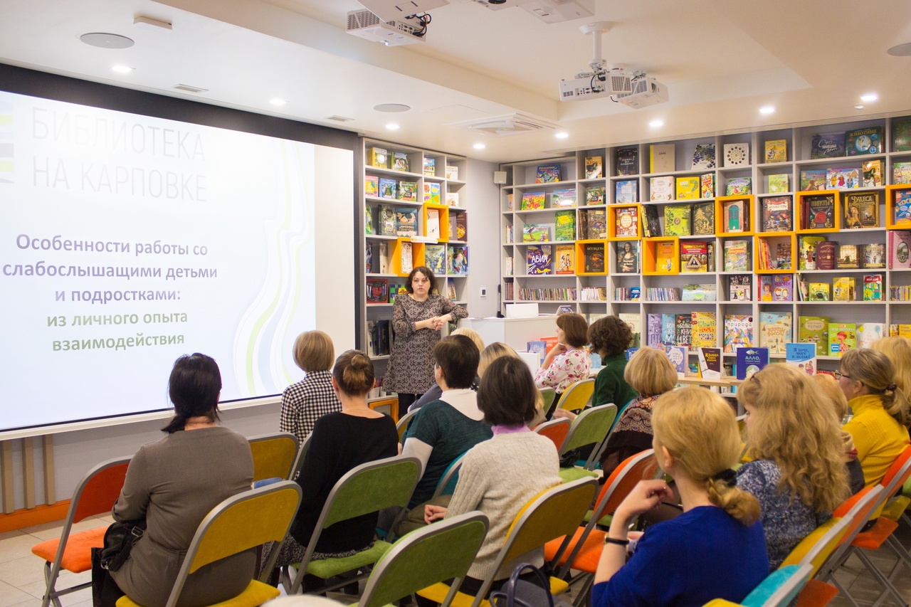 Библиотекарь Лариса Владимировна Керова представила доклад «Опыт работы с коррекционными школами в библиотеке», в котором раскрыла особенности работы со слабослышащими детьми и подростками в Библиотеке на Карповке (наб.р.Карповки, д.28).