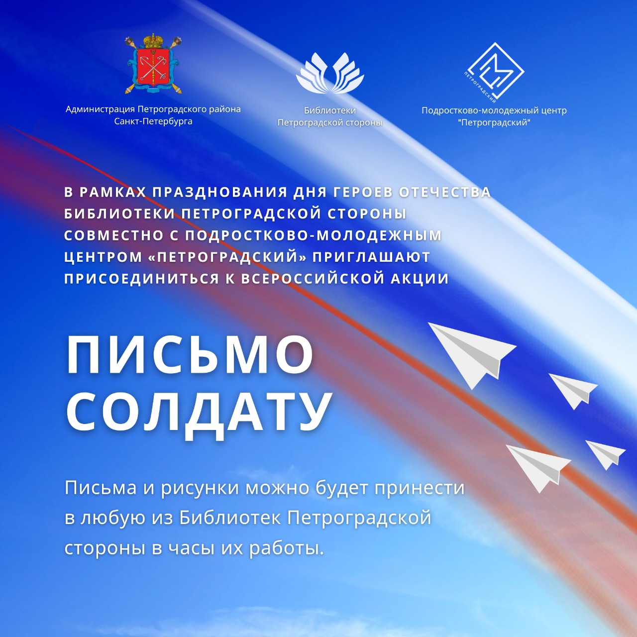 В рамках празднования Дня Героев Отечества СПб ГБУ «Централизованная библиотечная система Петроградского района» совместно с СПб ГБУ «Подростково-молодежный центр „Петроградский“» приглашают присоединиться к Всероссийской акции «Письмо солдату».
