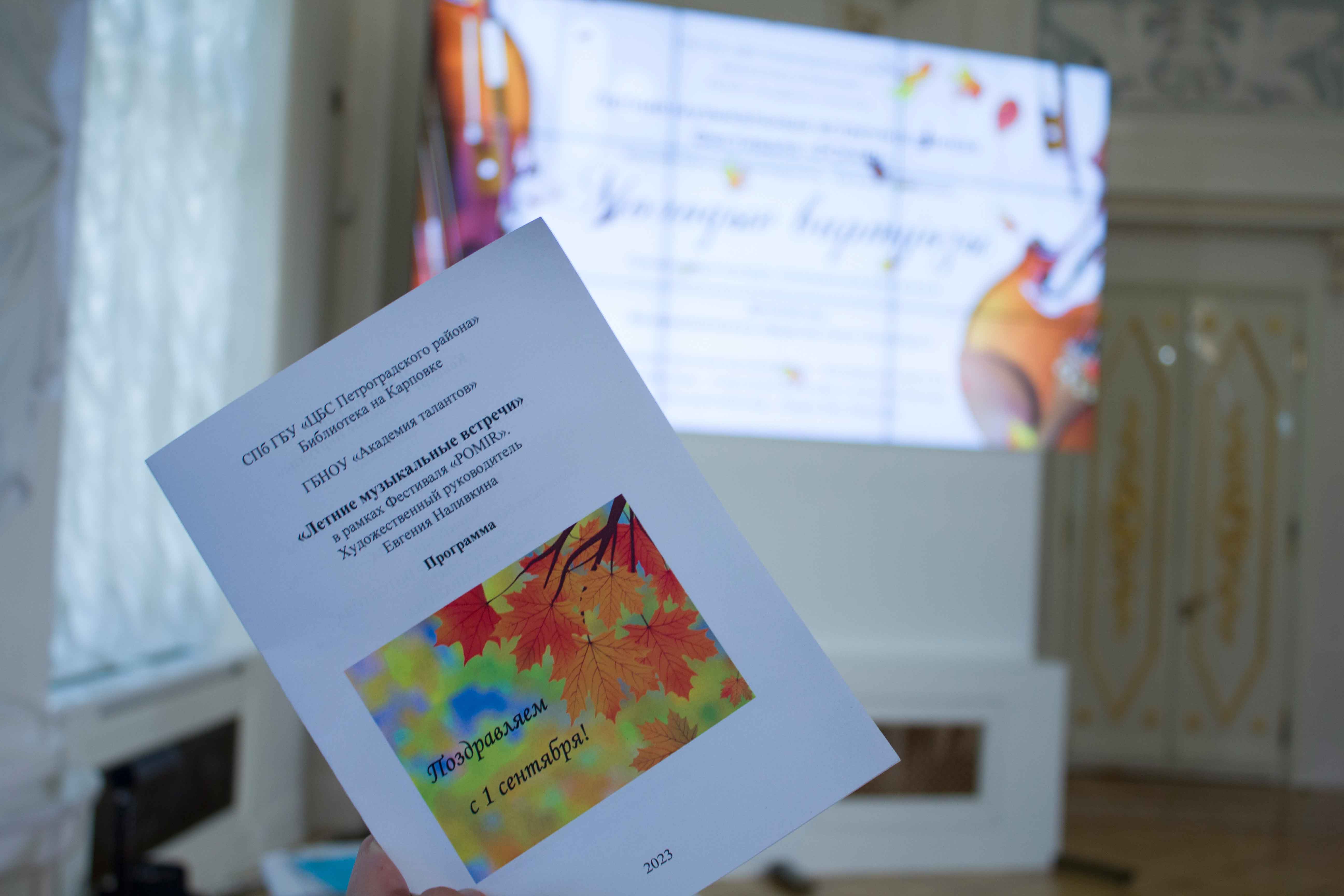 В преддверии нового учебного года уже по сложившейся традиции в гостеприимной «Академии талантов» 31 августа состоялись «Летние музыкальные встречи». Концерт «Молодые виртуозы», который прошел в рамках фестиваля «POMIR» (художественный руководитель Евгения Наливкина), организованным СПб ГБУ «ЦБС Петроградского района» и Библиотекой на Карповке, состоял из двух отделений.