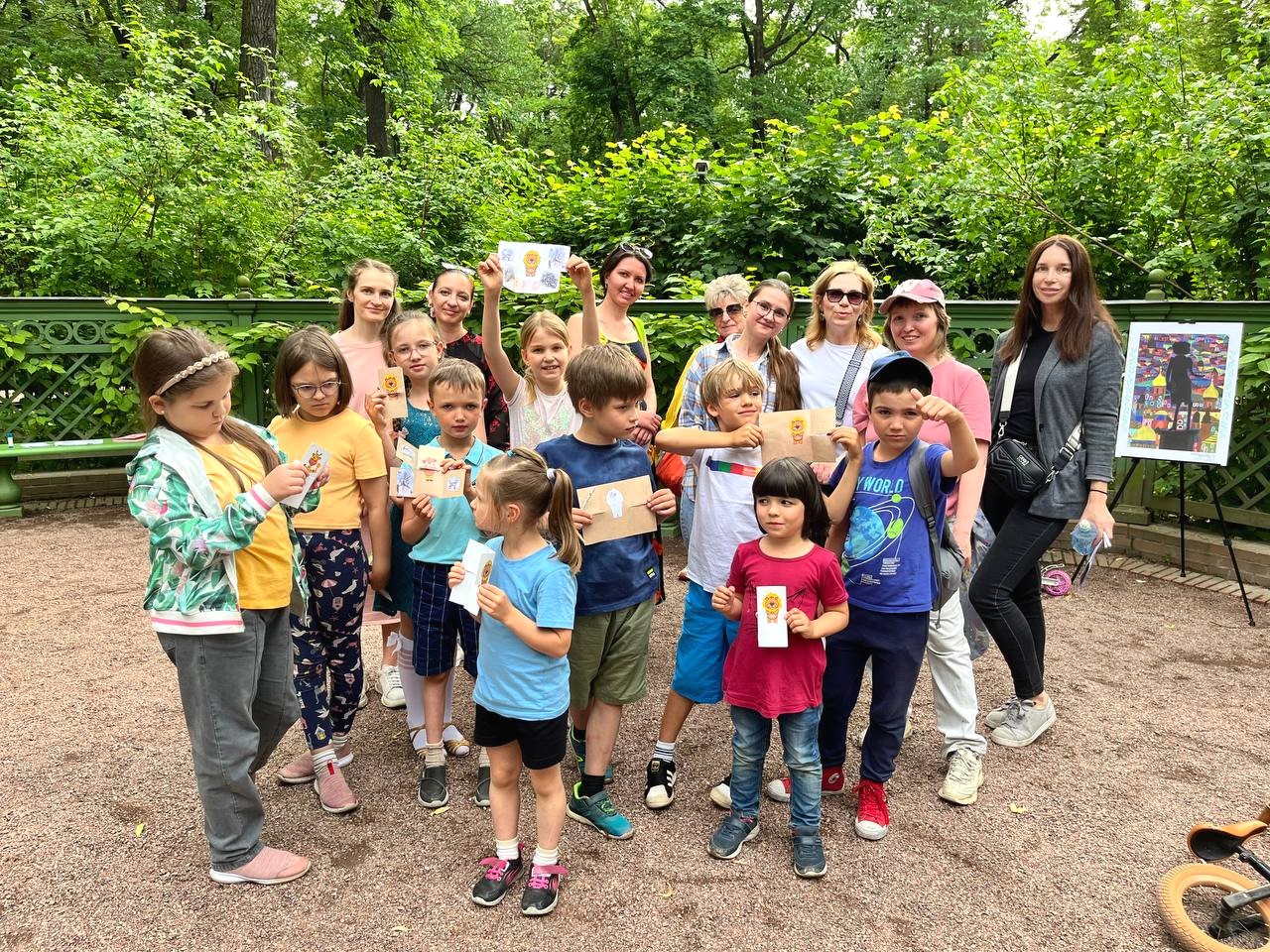 У боскета Французский партер участники прогулки расположились на скамейках. И здесь пришло время познакомиться с книгой Ю. Ивановой «Чижик-Пыжик и побег из Летнего сада». Библиотекари рассказывали о том, как создавался памятник, а читатели находили героев басен на постаменте, читали басни Крылова. А в конце прогулки всех ждал мастер-класс — книга превращений, приютившая на своих страницах замечательных волшебных зверей.