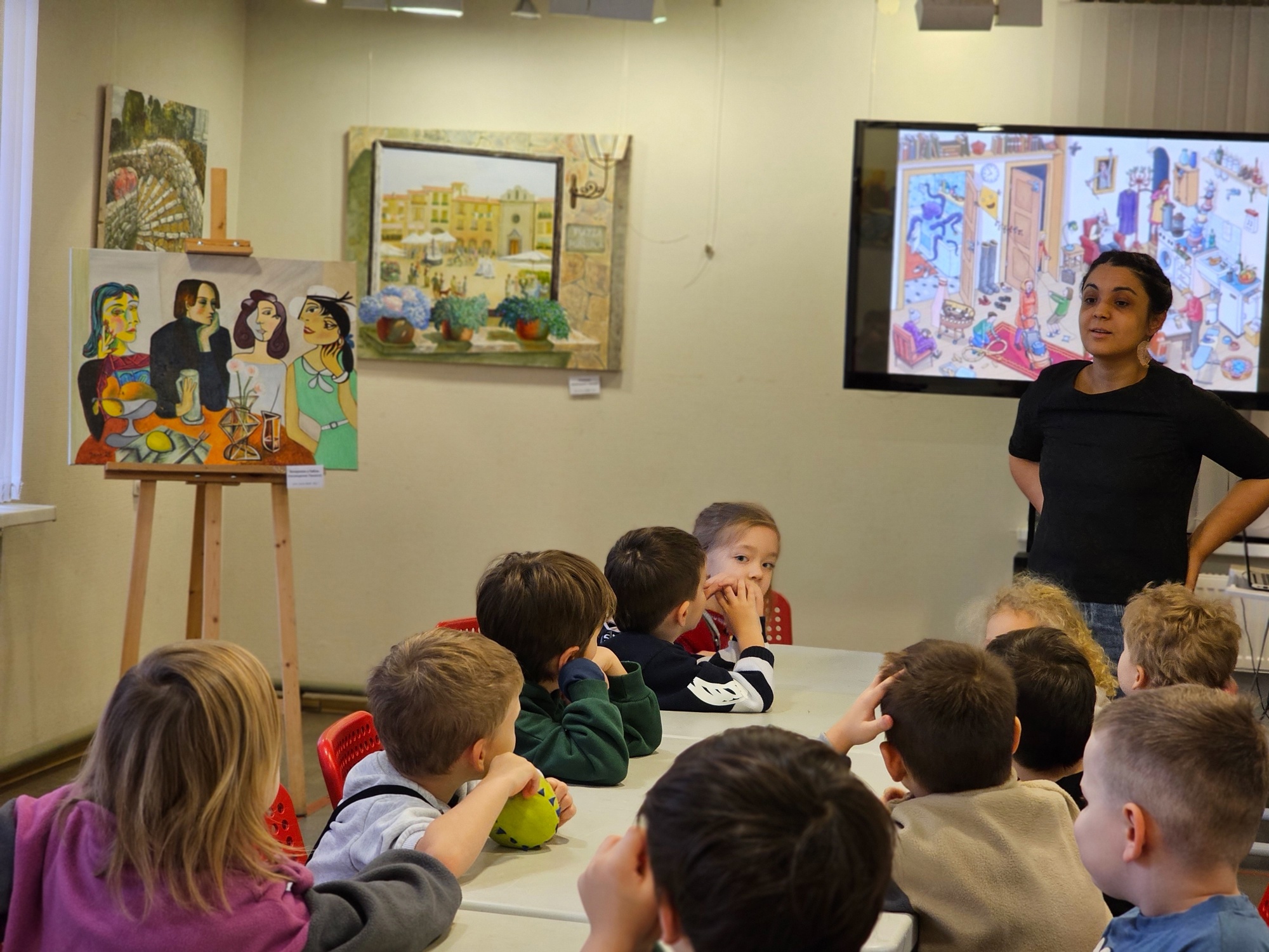Разгадав все звуки, ребята приступили к картине на экране, ведь там в результате волшебства произошло много странностей. Но ребята нашли их все! А в конце занятия вместе дети учились искусству пантомимы – изображали сюжеты картин с помощью жестов, без слов.