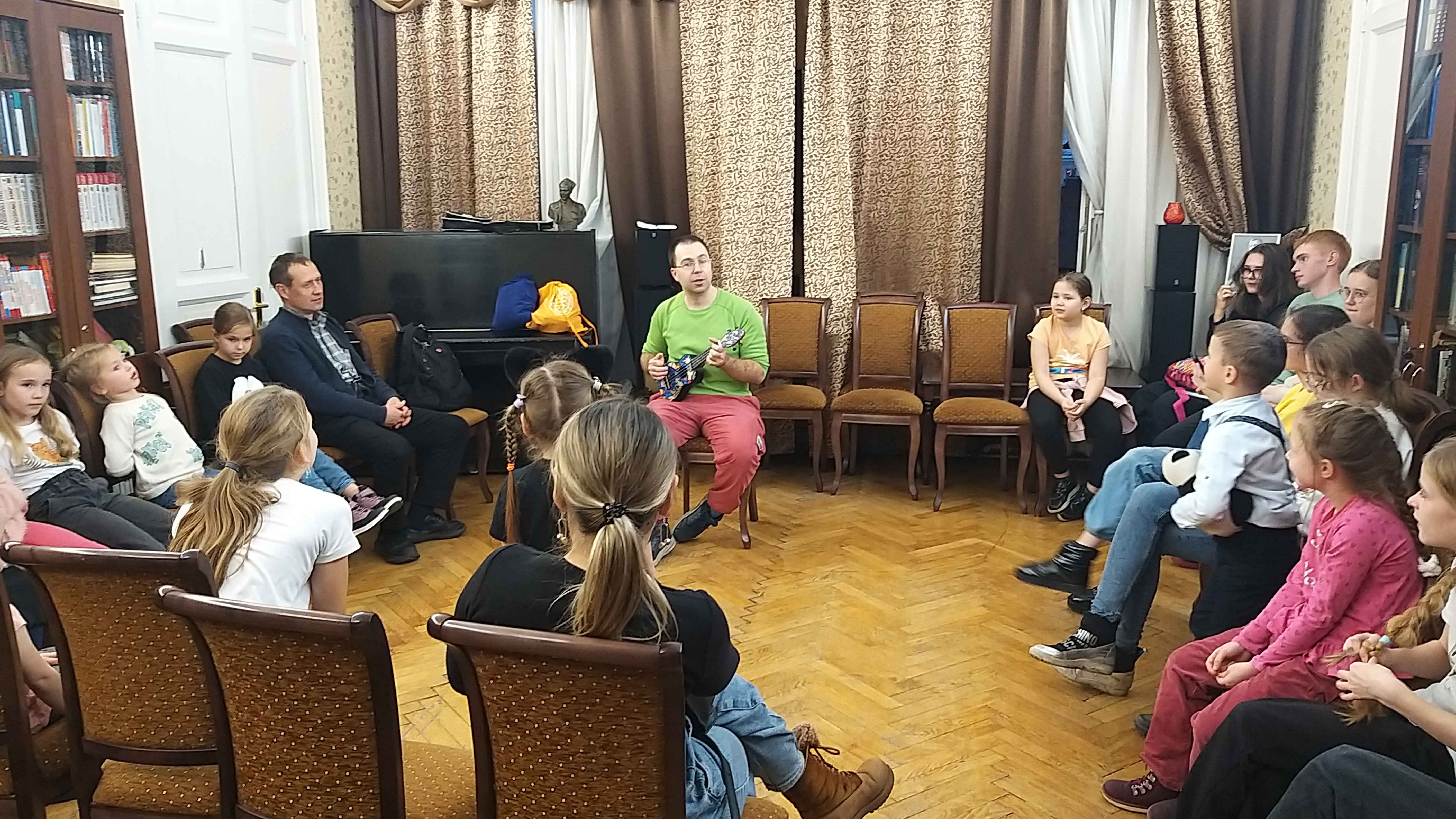 Недавно в Библиотеках Петроградской стороны прошли мастер-классы по жонглированию и клоунаде, которые провел артист Олег Духовников. Он сразу увлек всех игрой, предлагал взрослым и детям актёрские упражнения и музыкальные импровизации, музыкальные лекции по игре на укулеле, учил жонгировать булавами и невесомыми платочками, отвечал на вопросы об искусстве и жизни клоуна.