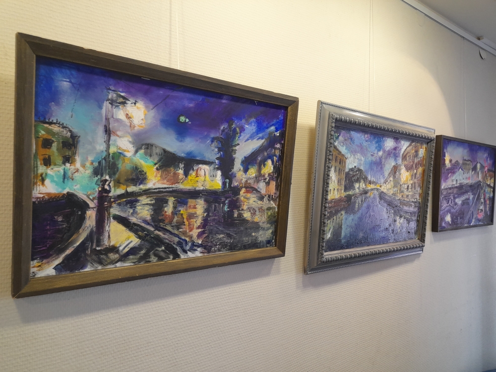 Но и это ещё не всё – в творчестве Людмилы Пигиной проявляется ещё одна грань нашего города – это ночной город. Ночной город оживает в ярких огнях на фоне фантастического ультрамаринового неба. На выставке представлено несколько работ – проба кисти, настрой на дальнейшую работу.