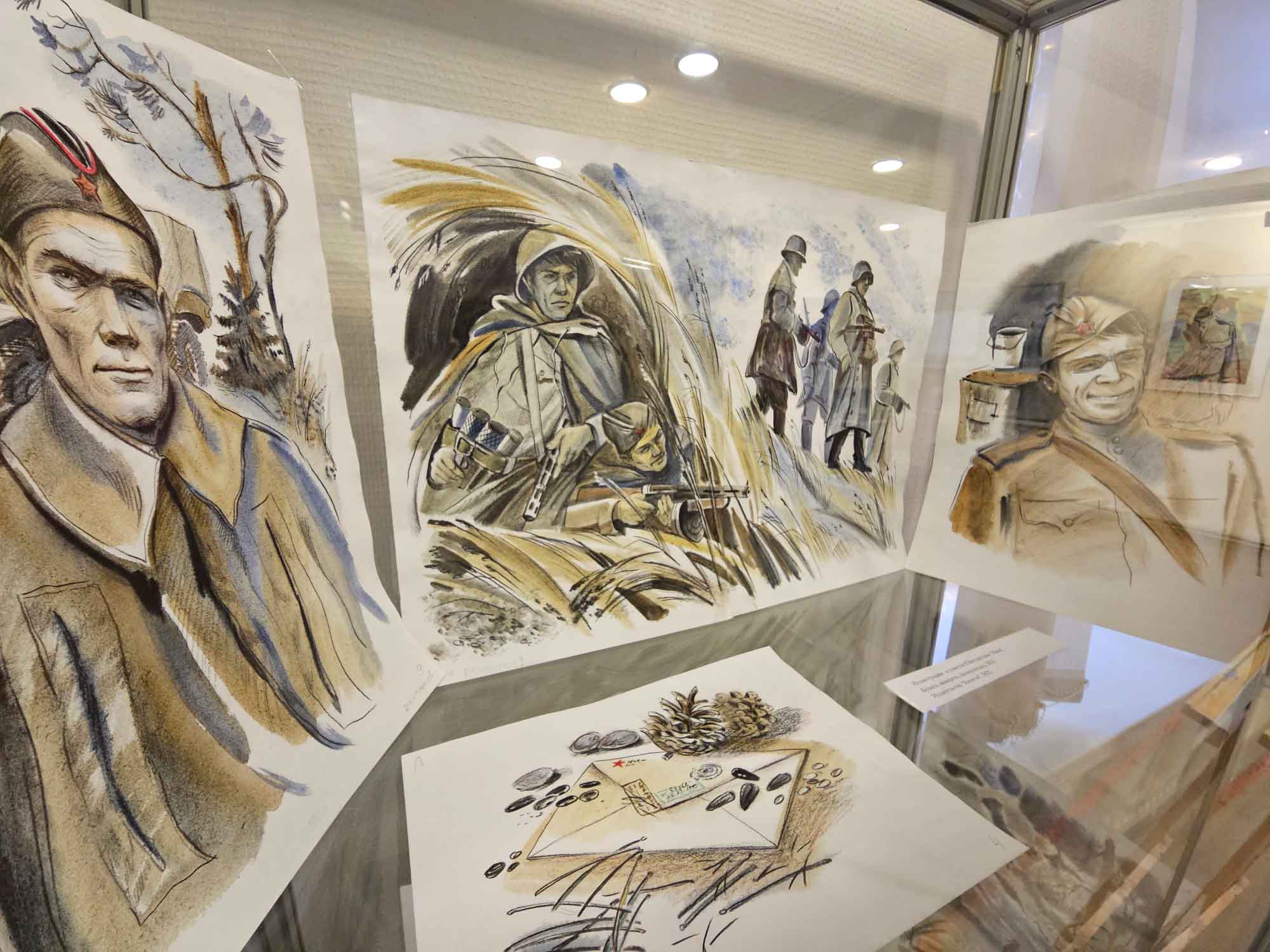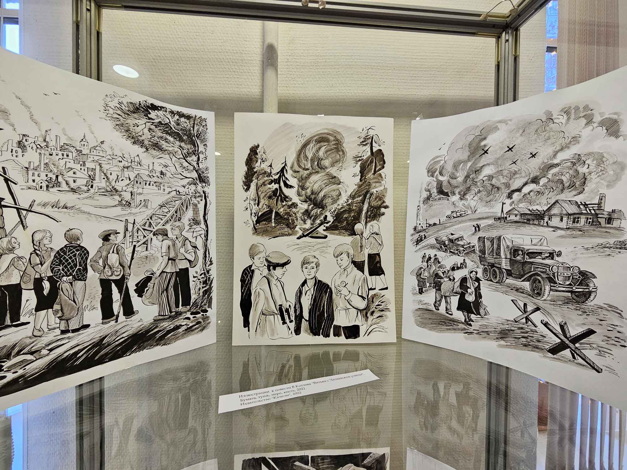 Помимо отдельных работ печатной и станковой графики, экспонируются иллюстрации к повестям Вильяма Козлова «Витька с Чапаевской улицы» и Владимира Богомолова «Иван», выполненные для издательства «Качели» и вышедшие в серии «Опаленные войной» в 2022 году. Обе повести рассказывают о драматических событиях в жизни подростков в годы Второй мировой войны, их переживаниях, взрослении, преодолении внешних обстоятельств и внутренних страхов.