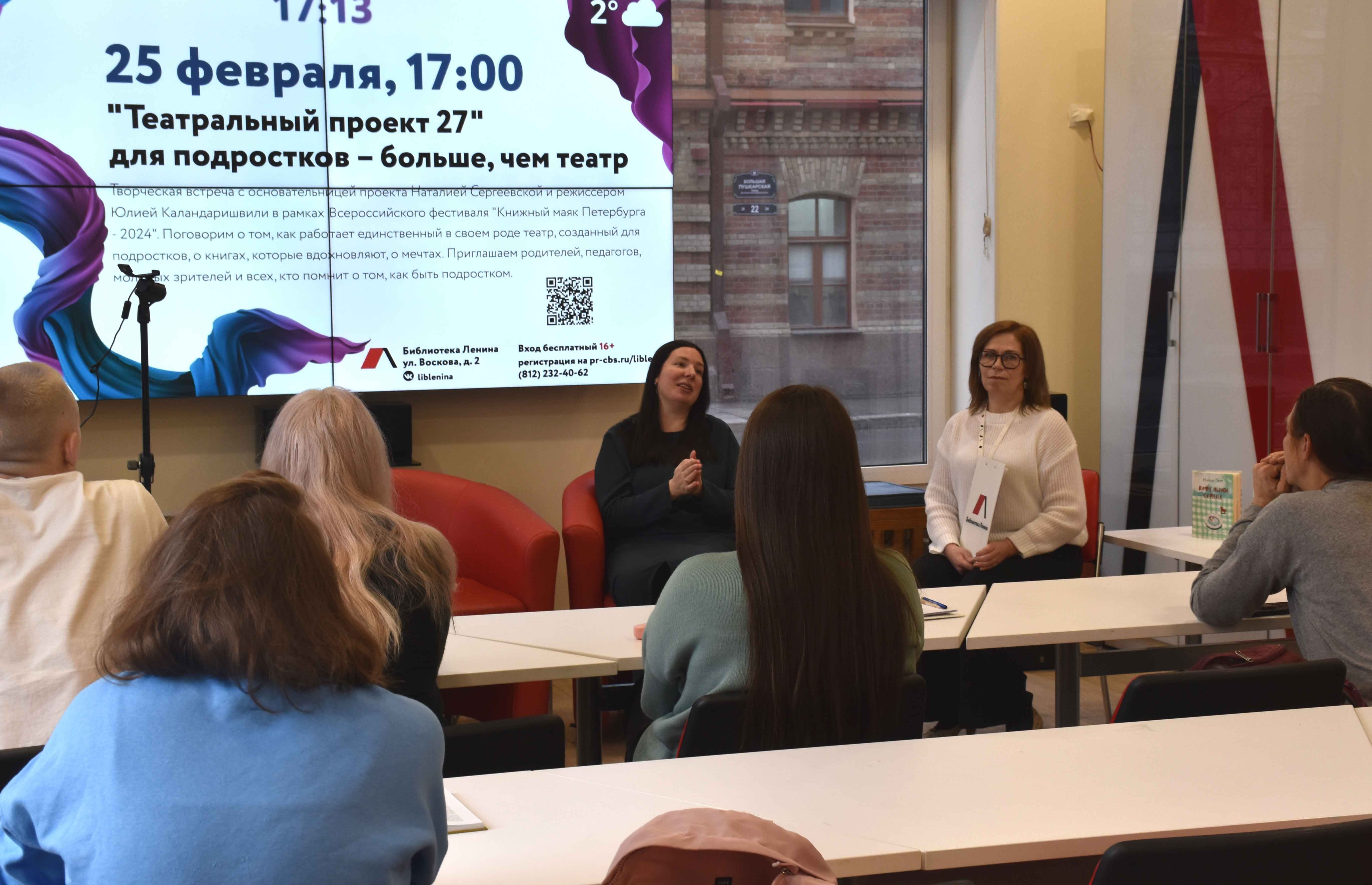 25 февраля в библиотеке имени В.И. Ленина (ул. Воскова, д. 2) в рамках фестиваля «Книжный маяк Петербурга» состоялась встреча с представителями театра для подростков «Театральный проект 27» - создателем и директором театра Наталией Сергеевской и PR-директором Алиной Герр.