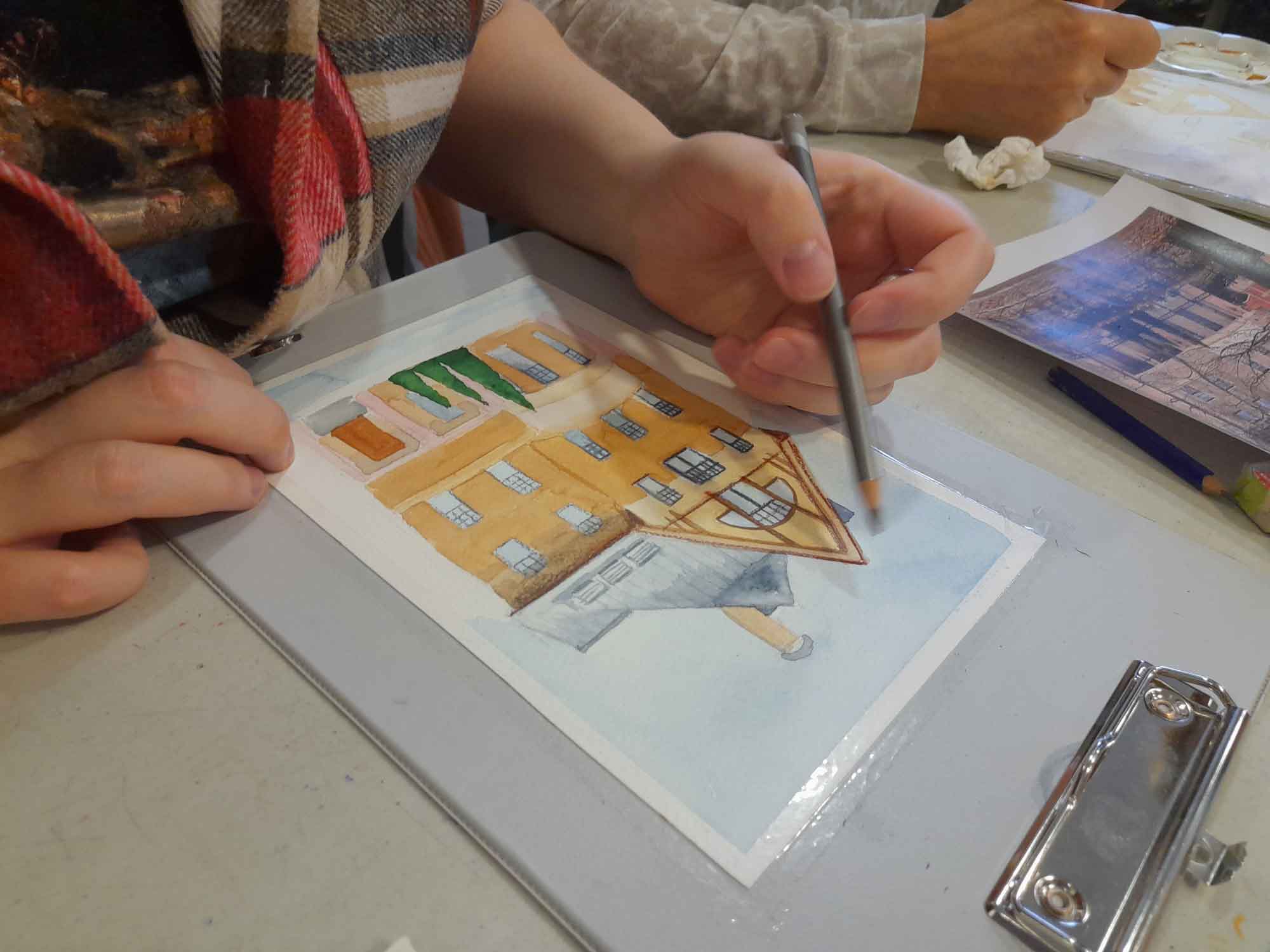 3 февраля, на открытии выставки прошел мастер-класс «Акварельный Крестовский». Участники мастер-класса создали изображение одного из знаменитых зданий Крестовского острова – особняка П. М. Стенбока. Построенный в 1913 году по проекту инженеров А. П. Апышкова и В. Ф. Баумгартена в стиле модерн особняк является образцом монументального «дачного стиля». Изображение особняка Стенбока было выполнено в смешанной технике с использованием акварели и цветных карандашей.