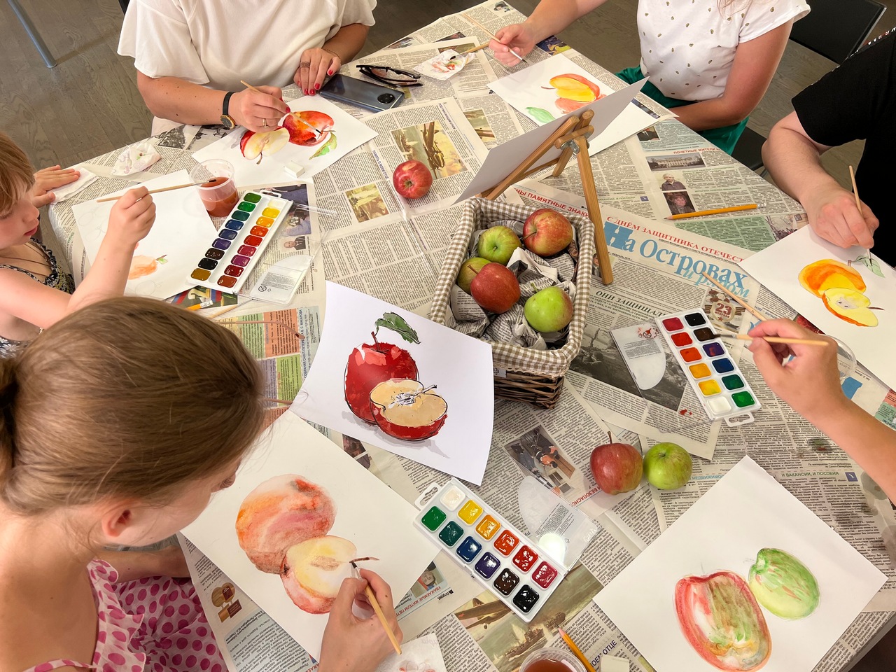 В технике тонкослойного наложения краски и использования бумаги не просто как материала, но и как изобразительного элемента, у каждого участника мастер-класса получились рисунки невесомые и лёгкие, будто наполненные воздухом изнутри. Изображения яблок отразили символизм первых праздников урожая, с которых, согласно поверьям, природа разворачивается от лета к осени. Мастер-класс провела студия «Творческие сезоны» (г. Москва).