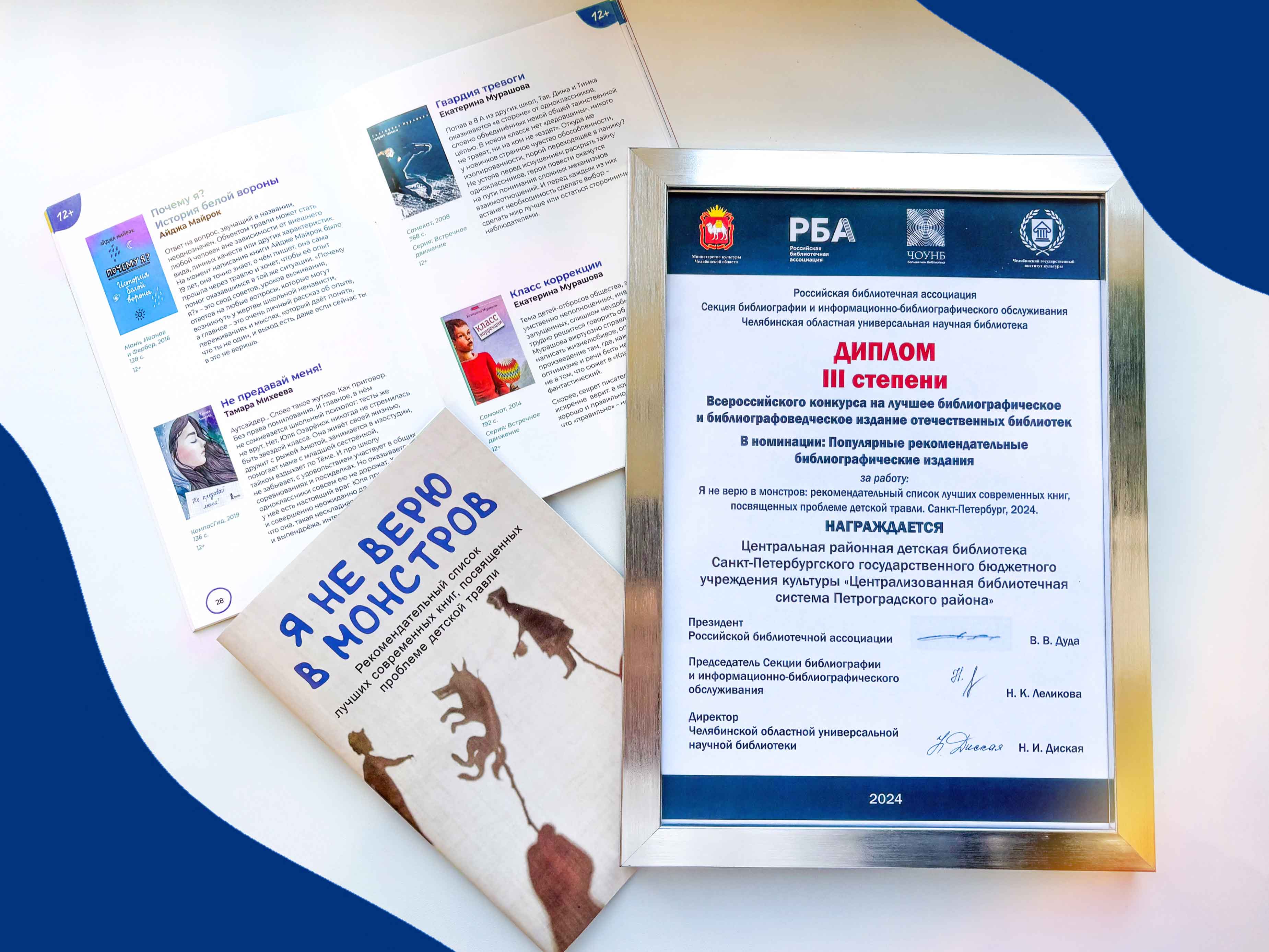 🏆Дипломом 3 степени в номинации «Популярные рекомендательные библиографические издания» награждена команда Библиотек Петроградской стороны за рекомендательный список современных книг, посвященных проблеме детской травли «Я не верю в монстров».