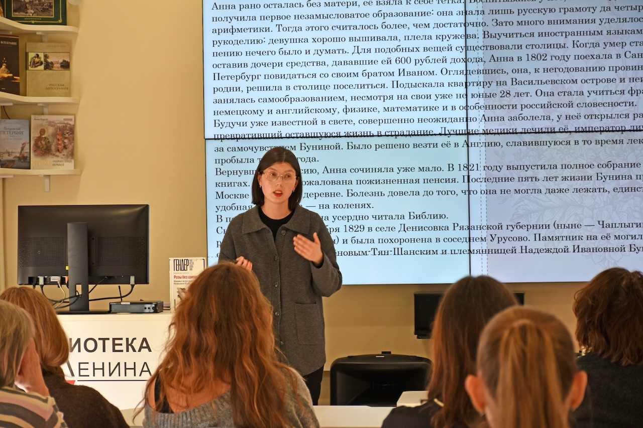 На примере судьбы первой русской поэтессы Анны Петровны Буниной лектор проследил, как пересматривались принципы литературного творчества, а также как проходило постепенное усиление роли «женского письма», признание его достоинств и недостатков. Слушатели с особым вниманием и симпатией отнеслись к личности Анны Петровны, преодолевшей много сложностей и противоречий на своем творческом пути. Особенно их поразила писательская участь Буниной, которая вследствие трансформации литературных критериев оказалась со временем одной из преданных забвению поэтесс. Ее творчество на долгие годы оказалось недоступным.